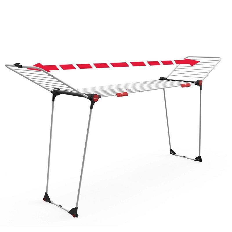 stendibiancheria estensibile, in grado di garantire una superficie di stenditura massima di 30 metri per un utilizzo pratico e confortevole. Hai bisogno di asciugare tovaglie, lenzuola o capi ingombranti? Grazie alla griglia centrale telescopica (estensibile da 117 e 205 cm), puoi stendere facilmente capi di grandi dimensioni senza piegarli. Dato che la griglia è a 1 metro di altezza da terra, non c’è rischio che tocchino il pavimento. Le nuove grandi ali permettono di appendere anche capi più lunghi come pantaloni o abiti. Inoltre, piccoli capi come calzini e biancheria intima possono essere posizionati rapidamente nei 2 supporti dedicati senza bisogno di mollette. Realizzato in acciaio e alluminio, è progettato per essere usato in tutti gli ambienti.