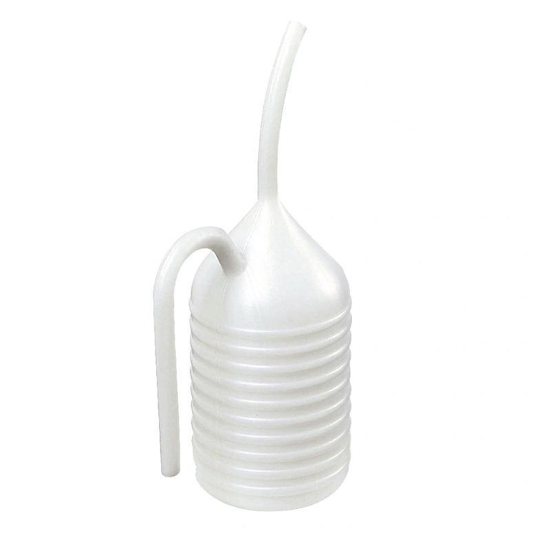 Tira olio in PEHD (Polietilene ad alta densità) bianco con funzionamento a depressione: aspirando aria dal tubicino superiore, il liquido viene aspirato nel serbatoio.